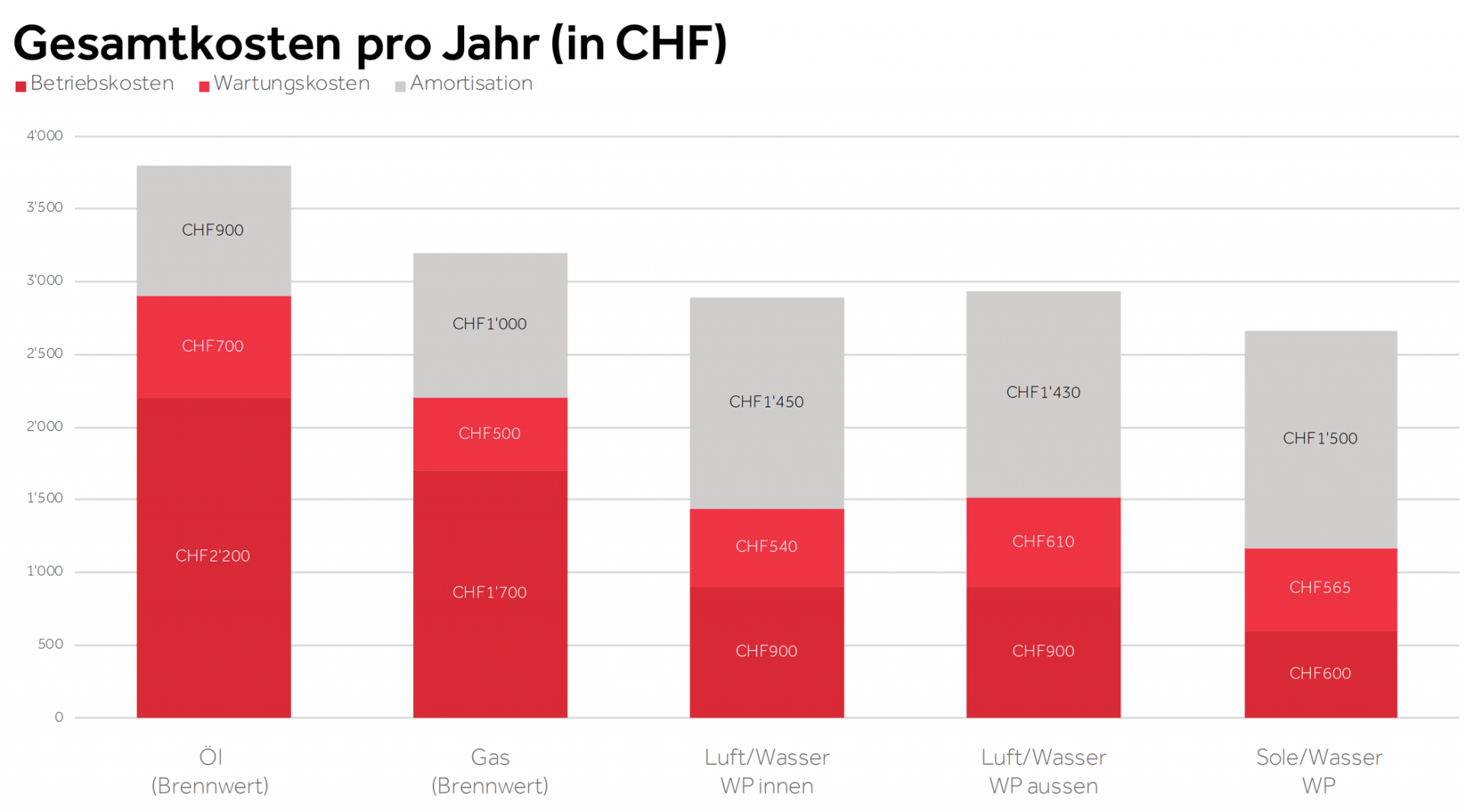 Die Erdsonde-Wärmepumpe weist die höchsten Investitionskosten auf. Der grösste Teil der Investition - die Erdsonde - kann im Regelfall 50 Jahre, oftmals sogar darüber hinaus betrieben werden. Trotz der hohen Grundinvestition ist die jährliche Abschreibung einer Erdsonde-Wärmepumpe mit 1'500 CHF jedoch nur geringfügig höher als bei den anderen Heizungen. Zusammen mit den sehr tiefen Betriebskosten der Heizung ergibt sich in der Endabrechnung damit ein sehr vorteilhaftes Bild. Die Erdsonde-Wärmepumpe ist trotz Abschreibung mit jährlichen Gesamtkosten von ca. CHF 2'700 klar am geringsten.