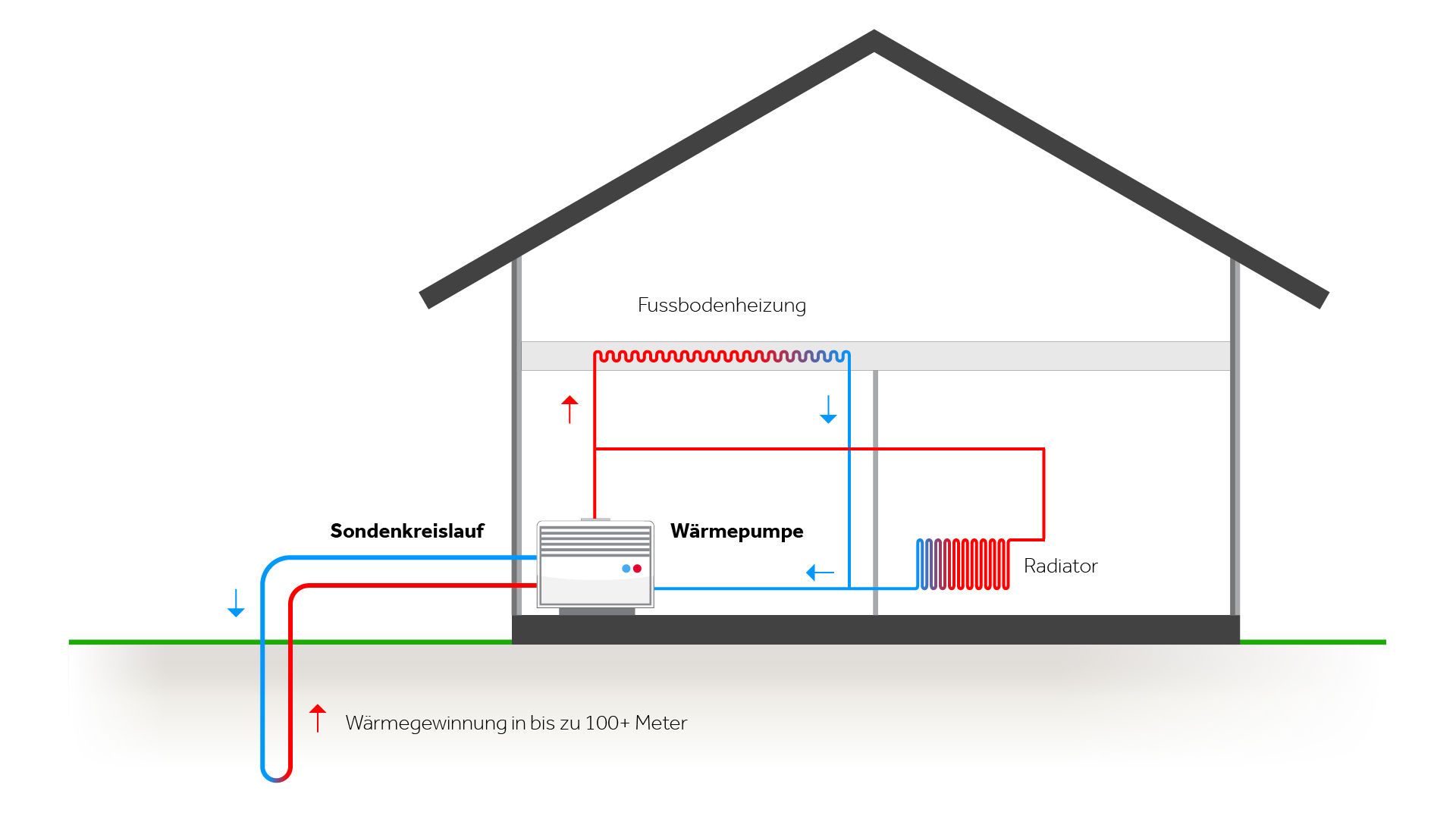 Die Wärmepumpe besteht aus 3 Kreisläufen: Im ersten Kreislauf zirkuliert Wasser, das über die Sonde in die Erde eingeführt wird. Im zweiten zirkuliert ein Kältemittel, mittels dessen die Funktionsweise der Wärmepumpe bereitgestellt wird. Im 3. Kreislauf befindet sich das Heizungswasser, das von der Wärmepumpe aufgewärmt wird.